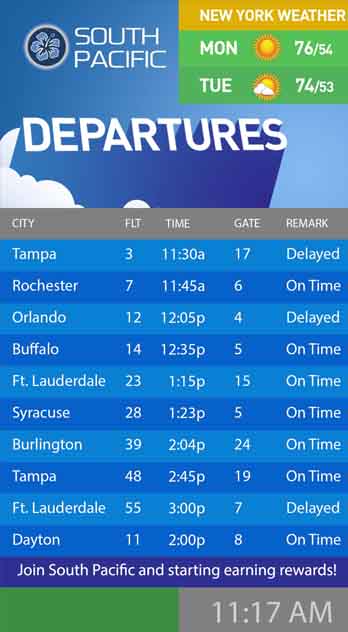 The flexibility of Engage makes it an ideal addition to gate areas. Once passengers have arrived at their departure gates, a digital advertisement for the nearest restaurant or retail concessionaire can show them how to spend their time before boarding. For the early morning hours, users can schedule Engage to run a coffee shop advertisement to point passengers to the closest coffee provider.