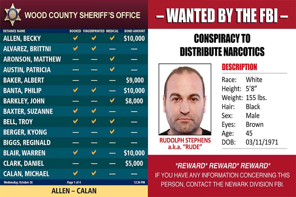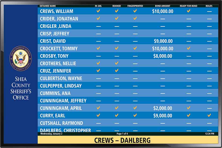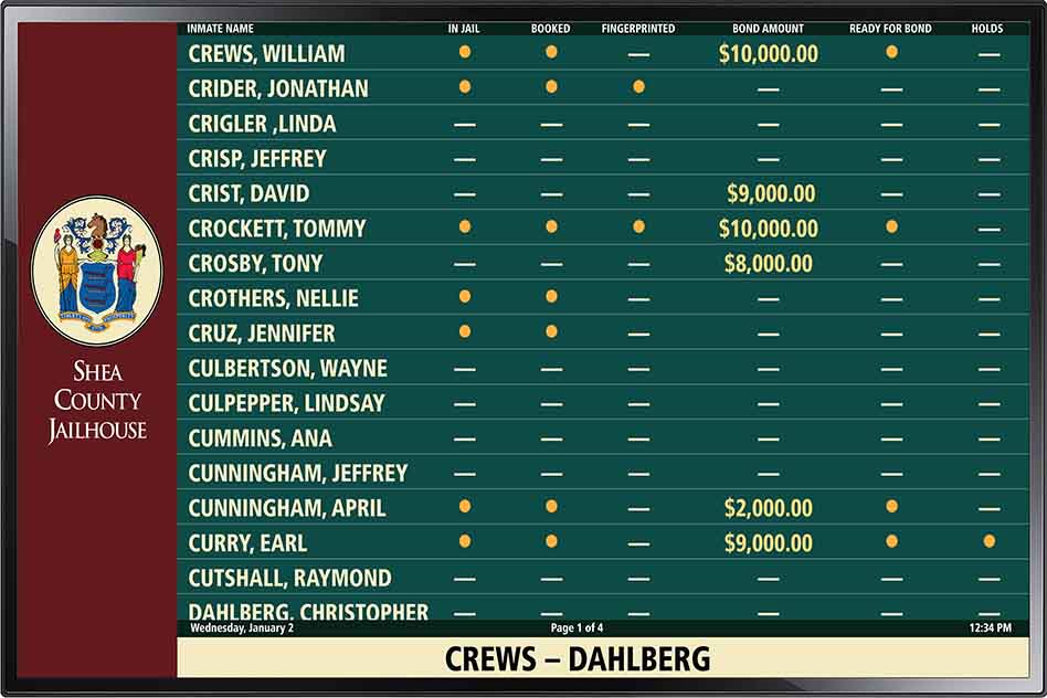 Engage is a digital signage solution that allows authorized jail personnel to create Most Wanted listings, bond company advertisements, public messages and more to display on monitors in the jail. The solution includes a drag-and-drop interface that makes it easy to place images, videos, and content on pages being created. Authorized users can modify the facility’s Engage creations at any time and use the scheduling tool to control when specific creations are displayed on the monitors.