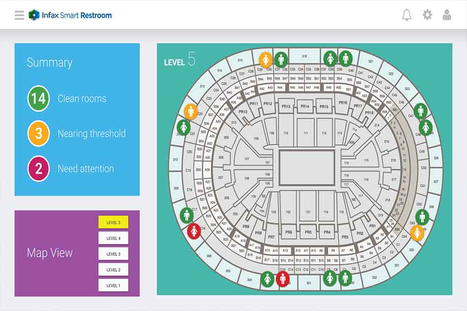 SmartRestroom turns venue restrooms into intelligent data-collecting environments that improve the overall customer experience. This à la carte solution allows public venues to choose from a set of features to customize their system to their specific needs. Included in this feature set are customer throughput counting, passive janitorial staff monitoring, smart locks and lights, digital occupancy displays, automatic cleaning alerts, and customer feedback surveys.