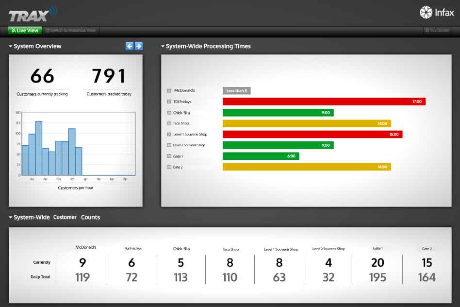 TRAX gives public venues the power to make data-driven decisions that improve the overall customer experience and generate more revenue. This queue management solution uses Bluetooth and video analytic technologies to monitor customer flow and count in different areas of public venues. Using TRAX, venues can determine which restaurants and vendors are the most popular with customers, which events have higher attendance, and other insights that can be used to drive critical decisions that will impact the future success of the facility